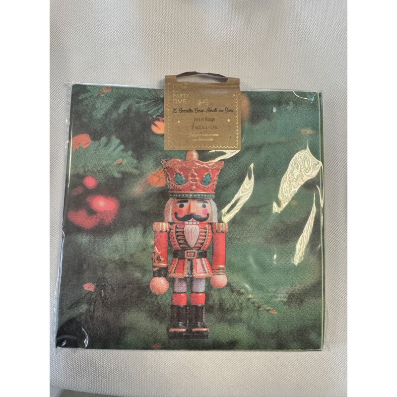 20 Serviettes Casse-Noisette sur sapin vert et rouge 32,5 x32,5cm.